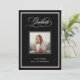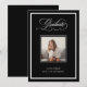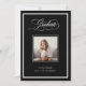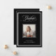 Denna formella och moderna klass 2026 examensmeddelande har en mörk, svart bakgrund med en klassisk vit ram. Ett foto av examen går i mitten, och elegant fancy kalligrafi skript säger "examen" längst upp. En lyxig, sofistikerad look för den vuxna examen.