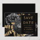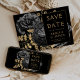 Den här eleganten har det moody bröllop spara datum-kortet en lush, romantisk blommigt bouquet i svart med guld faux foil och glitter blad i svart bakgrund. Anpassa guld-färgad-texten i snyggt typsnitt på en svart rektangel på guld och lägg till bröllop webbplats-URL:en till den helsvarta baksidan.