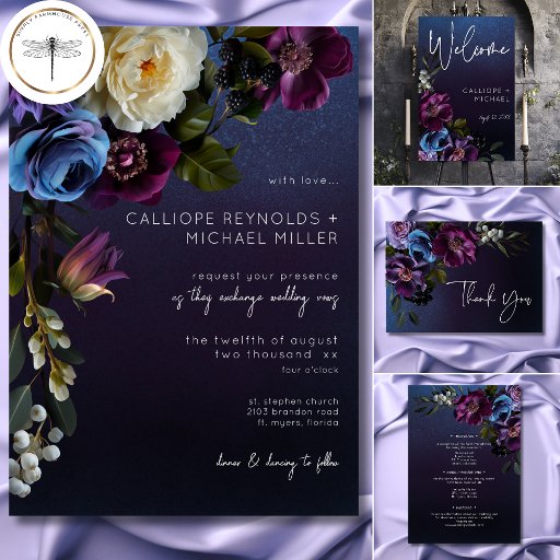 Vi presenterar vår uttryckliga bröllopsinbjudan som utan problem förenar modern elegans med vintage allure. Mot en moody marin blå bakgrund kommer en mjuk, lös bukett till liv, med mörkens lila, lavender, periwinkle blue och gräddvita blommor bredvid mörkens lila bär och ömtålig botanisk grey. Blandningen av färg symboliserar rikedomen i din resa tillsammans, medan vintagen känner att det gör contemporaryn mer nostalgisk. Ställa in ett bröllop som harmoniskt förenar det bästa av båda världar - ett firande som är känsligt och modernt men som har det förflutnas tidlösa skönhet. Skapat av Farmhouse Press. Om du vill ha anpassningsbar delarare eller om du vill begära en produkt som inte finns i vår butik kan du skicka e-post till simplyfarmhousepress@gmail.com.