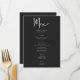 Den här menydesignen i bröllop har en mörk, ett moody tema som är enkelt, men ändå bedövande. En svart bakgrund i mörk är perfektens arbetsyta för din måltid i bröllop. Baksidan har en enda tealblått matt, dess vingar-spridning för flygning, tillsammans med parets första datum namn och bröllop. Unik och elegant, den här utformningen kan användas för vilken säsong som helst. Skapat av Farmhouse Press.