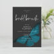 Den här inbjudan till möhippa har en mörk, ett moody tema som är enkelt, men ändå bedövande. En svart bakgrund i mörk är perfektens arbetsyta för en enda tealblått matt, dess spridning i vingar för flygning. Unik och elegant, den här utformningen kan användas för vilken säsong som helst. Skapat av Farmhouse Press.