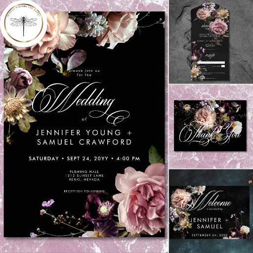 Mörk Moody Pastel Opulent Blommigt Black Bröllop Tack Kort