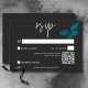 Svarskortet i bröllop med QR-kodutformning har en mörk, ett moody tema som är enkelt, men ändå enastående. En svart bakgrund i mörk är perfektens arbetsyta för en enda tealblått matt, dess spridning i vingar för flygning. Unik och elegant, den här utformningen kan användas för vilken säsong som helst. Skapat av Farmhouse Press.