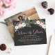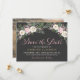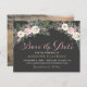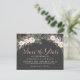 Vår vintage Bho blommigt bröllop-foto sparar datumkorten med en moody blommigt arrangemang av romantiskt rosor, peonblommor och anemonblommor, grönnjur och orustiska bohemiska ludderskarvar i riker av dammig ro, mauv rosa, kassis, gräddvit, moss grönt, grått och guld på mörk/svart bakgrund grått. Ett dramatiskt och drömt färg-program för ditt fall eller vinterbröllop. Anpassa fotot och den vackra anpassningsbarna till elegantens roliga bröllopsdag.
