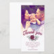 Baptismfotokortets personlig med ett foto av dig vacker baby. Tack för att du skrev i ett fantastiskt plumpenselskript på mörk ovanför en bukett med rosor i coola färger av djup violett och blek rosa, och ett personligt meddelande till era baptismgäster. kant mellan fotot och text i bröllop mjukas upp med en vit övertoning. Lägg till namn också!