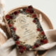 Gör ett djärvt påstående med den här mörken och romantiska bröllop-designen, som innehåller djup krimson ro, sluga svarta snöre-accenter och botaniska detaljer om vintage. Perfekt för gotskt, moody eller viktorianinspirerat firande, den här blommigten ger dig en luft av tidlös elegans till din speciella dag.