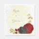 Romantiska rödblommor och svarta blommor med guld löv mörkar botaniska bröllop pappra napkin.