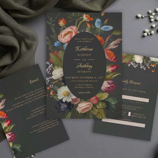 Moodig romantisk bröllopsinbjudan, mörk blomsterbröllopsdesign, gotisk romantisk bröllopstema, mjuka dämpade blommor på mörk bakgrund, elegant målad blomsterbröllopssvit – detta svarsbrev är till för en brud som dras till djup, kontrast och tyst romantik. Konsten blandar mjuka, avsaktade blommor med skuggiga toner och skapar en skiktad, nästan eterisk look som känns både förfinad och känslomässigt rik. Subtila ljus och mörker ger blommorna en naturlig, målad dimension, som om de är upplysta av lågt ljus mot en djup, moody bakgrund.