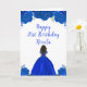 Det här födelsedagskortet innehåller blommor av blå blommigt från glitter royal och en vacker prinsessa med mörk och en elegant klänning. Det här är perfekt för en födelsedagsfest.