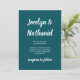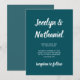 Denna enkla och minimalistiska bröllopsinbjudan har en solid mörk tealfärgad bakgrund, med en matchande ljusare nyans på baksidan, och fet modern typografi.