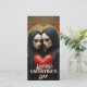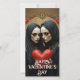 Mystiska tvillingfigurer i fladdrande svarta slöjor vaggar ett väderbitet scharlakansrött hjärta, omgivna av utsmyckade vintageornament och djupröda rosor. En dramatisk valentin-design som förenar romantik, skugga, symmetri och tidlös gotisk elegans.