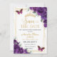 Sätt tonen för din speciella dag med detta fantastiska mörkt kungligt lila blomstermotiv "Spara datumet"-kort, perfekt för bröllop, Quinceañeras, Sweet 16-fester, Bat Mitzvahs, brudshower och mer. Med rika lila blommor, graciösa fjärilar, en chic guldgeometrisk ram och glänsande guldfärger fångar denna design modern elegans med en lyxig twist.