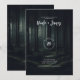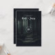 Mörka stämningsfulla skogsträd vid skymningsbröllo inbjudningar