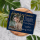 Unika och trendiga gratulationskort för examen och inbjudningskort för firande av fest, med en klassisk falsk glänsande guld kalligrafisk typsnitt på en chic mörkblå midnattsblå bakgrund. Med utrymme för att anpassa eller personliggöra med ett foto, namnet på den utexaminerade, examensår, gymnasieskola och framtida högskola eller universitetsnamn. Låt familjen, vänner och grannar veta att det finns en lycklig examen redo att erövra världen, och inbjuda alla att komma och fira det glada evenemanget med dig!
