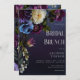 Inbjudan till detta bröllopsfest brunch har en mörk, melankolisk marinblå bakgrund med en vacker blommig sidostrålning av lila, vinröd, vit och blåklocka med mörkgrön lövverk och mörklila bär. Skapad av Simply Farmhouse Press.