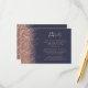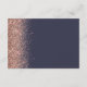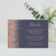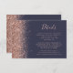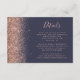 Den vänstra kanten på detta eleganta moderna bröllopsdetaljkort har en roséguld falsk glitterdesign. Den anpassningsbara texten kombinerar blek rosa färgad handskrift, kopparplåt och kursiv stil på en mörkblå bakgrund. Baksidan har en matchande mörkblå och roséguld glitterdesign.