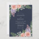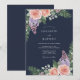 Denna design har en djup mörkblå bakgrund som kontrasteras av ömtåliga persikoröda rosor och klasar av lila syren. Frodiga gröna tallgrenar och yppig lövverk ger en naturlig touch till den vinterinspirerade färgpaletten. Den övergripande stämningen är sofistikerad och romantisk, perfekt för en säsongsbetonad kallvädersceremoni.