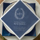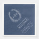 Oval krans blad design n vit på marinblå bröllops servetter. Lägg till ditt eget pars monogram initialer, namn och bröllopsdatum i en klassisk vit på marinblå mörkblå. Andra färger och matchande bröllopsartiklar tillgängliga. © Original blad ritning och design av Sarah Trett för www.mylittleedenweddings.com på Zazzle.