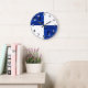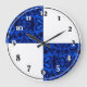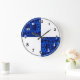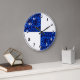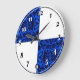 Denna vackra klocka är dekorerad med kvartsmarkeringar, omväxlande svarta siffror på vit bakgrund och vita siffror på ett elegant mörkblått satinmönster.