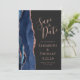 Det moderna bröllop spara datum-kortet från elegantens lämnat kant har en marin blåfärgad agate gräns som trimmas med faux ro guld glitter. Med anpassadet kombinerar du handskrift, ritplatta och kursivt typsnitt på ro med svart bakgrund. Den omvända sidan har en matchande marin blå utformning och ro guld-agatdesign.
