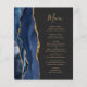 Den moderna bröllop-menyn på den lämnat kant i eleganten har en marin blå vattenfärg som ruttnar gräns med faux guld glitter. Anpassadet kombinerar handskriftsskript för guld-färgad och typsnitt för kopieringsskylt på en bakgrunds svarta bakgrund. Den omvända sidan har en matchande marin blå och guld-agate-design.