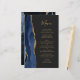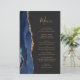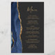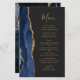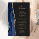 Den moderna bröllop-menyn på den lämnat kant i eleganten har en marin blå vattenfärg som ruttnar gräns med faux guld glitter. Anpassadet kombinerar handskriftsskript för guld-färgad och typsnitt för kopieringsskylt på en bakgrunds svarta bakgrund. Den omvända sidan har en matchande marin blå och guld-agate-design.