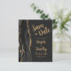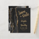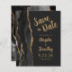 Det moderna bröllop spara datum-kortet från elegantens lämnat kant har en svart vattenfärgad agate gräns som trimmas med faux guld glitter. Anpassadet kombinerar ett modernt skript med guld-färgad och sans serif typsnitt på en svart bakgrund. Den omvända sidan har en matchande svartvit och guld agate-design.