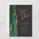 Det moderna bröllop spara datum-kortet från elegantens lämnat kant har en framväxande grönt vattenfärgsagat gräns som trimmas med faux guld glitter. Anpassadet kombinerar handskrift, rityta och kursivt typsnitt med guld-färgad på en svart bakgrund. Den omvända sidan har en matchande framväxande grönt och guld agate-design.