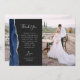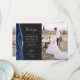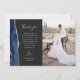 Skicka ett speciellt bröllop-tack till din familj och dina vänner med de här anpassningsbarna. På den lämnat visas ord "tack" i elegant silver grått-handskriftsskriptypografi på en svart bakgrund på ett kortfattat, redigerbart tack till gästerna i bröllop i mönstertypsnitt, med namnen nedan. En marin blåfärgad agat gräns som trimmas med faux silver glitter dekorerar det lämnat kant. Baksidan ger utrymme för ett andra vågrät-foto.
