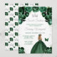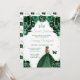 Denna eleganta och glamourösa sweet sixteen födelsedagsinbjudan har en vacker prinsessa med blont hår i en mörkgrön balklänning. Texten kombinerar handskriven skrift och moderna sans serif-teckensnitt för en klassisk och sofistikerad look. De blomsterarrangemang, fjäril och silverkonfetti skapar den perfekta blandningen av rustik och chic.