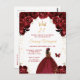 Denna eleganta och glamourösa födelsedagsinbjudan presenterar en vacker prinsessa med mörk hy i en burgunderröd klänning. Texten kombinerar handskriven skrift och moderna sans serif-teckensnitt för en klassisk och sofistikerad look. De blomsterarrangemang, fjäril och guld konfetti skapar den perfekta blandningen av rustik och chic.
