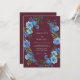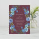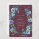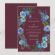 Denna design har en djup mörkröd bakgrund som accentueras av ett livfullt arrangemang av blå rosor och frodig lövverk. Det dystra färgschemat skapar en sofistikerad atmosfär perfekt för en sen säsongs bröllopsevenemang. Måleriska akvarelldetaljer ger en känsla av konstnärskap och elegans till det blomsterarrangemanget.