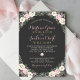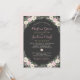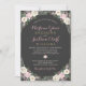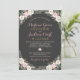 Denna bröllopsinbjudan har en djup kolbakgrund infattad med romantiska rosafärgade och elfenbensvita blommor och mjuk grönska. Eleganta namn i skrivstil tillsammans med ren och modern serif-typografi skapar ett modernt-romantiskt uttryck som passar perfekt för höst- och vintersammankomster. Perfekt för par som vill ha mörka blommor med tidlös typografi. Bröllopsinbjudan.