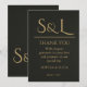 Uttry din tacksamhet med tidlös sofistikering med detta ultralyxiga svarta och gyllene tackkort. Med ett elegant överdimensionerat monogram i antikt guld på djupt mattsvart avslutar detta kort din bröllopsbrevpapperssvit med samma dramatiska elegans som den började med.