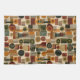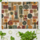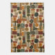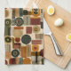 Sofistikerad mitten av seklet geometrisk mönster kökshandduk med lager av cirklar, valv, trianglar och rektanglar i skoggrön, bränd orange, ockra och kräm på en svart bakgrund. Rika texturer och retro-modern formgivning skapar en djärv design som är idealisk för Bauhaus-älskare, vintage-dekorationsfans och alla som dras till dyster modern stil.