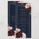 Anpassa detta eleganta bröllopsmenykort enkelt och snabbt. Klicka bara på knappen Redigera med hjälp av designverktyg för att redigera texten, ändra teckensnitt och teckensnittsfärger. Med vackra realistiska burgunderfärgade, rosa peonblommor mot en mörk marinblå bakgrund. Matchande artiklar finns i butiken. (c) Somerset Fine Paperie