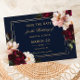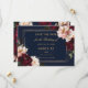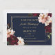 Anpassa detta eleganta bröllop "save the date" enkelt och snabbt. Klicka bara på knappen Redigera med hjälp av designverktyg för att redigera texten, ändra typsnitt och typsnittsfärger. Med vackra realistiska burgunderfärgade, rosa peonior och marinblå anemonblommor mot en mörk och stämningsfull marinblå bakgrund. Matchande artiklar finns tillgängliga i butiken. (c) Somerset Fine Paperie