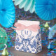 Den här jullpartysdesignen har en liten årtusendedesign med ett marint blått dammmönster på rosa. Det finns en ställe på översta klappen för att lägga till din monogramstart. Framsidan och baksidan har ett samordnande fuktmönster.