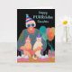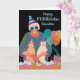 Grattis på PURR-födelsedagen, pappershälsningskort med en färgrik födelsedagskattfestillustration med en äldre dam och två katter i festläge. Katterna har födelsemössor liksom damen som också har mörkblå solglasögon. En rad cupcakes med födelsedagsljus står på bordet. Ballonger och en present ingår också i designen. Konst, bild och vers copyright © Shoaff Ballanger Studios, 2023.
