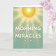 Designed with a glowing sunrise scene, the card shows a bright orb near the top sending warm golden rays downward like a gentle embrace. The background shifts from sunlit gold at the top into calm aquamarine and teal below, creating a smooth gradient that feels like two friends watching the day begin together 🌷. Centered in the middle is a white typographic message, with smaller words like “on this” and “of” placed between larger lines to guide the eye. Those smaller words appear in a flowing, cursive-style lettering, adding a soft, romantic touch next to the large all-caps words “MORNING” and “MIRACLES.” The white text stands out sharply against the glowing colors, and a faint shadow under each letter gives it a gentle lift from the background. Beneath the message sits a symmetrical white decorative flourish with curled lines and tiny circular accents, like a quiet promise shared between close companions 🐇. At the very bottom, the teal tones deepen slightly behind the flourish while the rays fade into a soft haze.