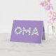 Mors dag-kort för Oma. Du kallar din mormor Oma, inte mormor. (Oma elaks mormor på tyska.) Föreställ er hur upphetsad Oma kommer att bli av med ett särskilt kort till Mors dag riktat till henne! Ditt omfång kommer också att ge det här blommigten ett vackert format som säger "Oma" skrivet i små vita blommor på framsidan, med lila bakgrund, och "Lycklig Mors dag!" skrivet i små vita blommor på insidan. Gör det här anpassadet! Klicka på "Redigera design", "Inuti Grund/Höger: Text & Bilder", "Text" och "Lägg till text" för att skriva din egen anpassningsbar, personlig meddelande till OMA inuti!