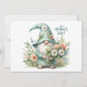 Lägg till en charmig touch till dina Mors dag-presenter och hälsningar med detta förtrollande vykort med en söt dvärg i teal klädd som håller en livfull bukett, omgiven av ömtåliga prästkragar och en fladdrande blå fjäril, ger denna design värme och nyckfullhet till dina hjärtliga meddelanden. Den eleganta ”Glad Mors dag!”-texten kompletterar den förtjusande estetiken och dekorativa accenter som firar mamma med stil.