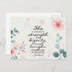 Med det inspirerande Mors dag-vykortet får du en vacker blommigt med rosa och blåa blommor och grön. Bible Verse Proverbs 31:25: "Hon är klädd med styrka och värdighet och skrattar utan att vara rädd för framtiden." Hälsning kan anpassas och kortet användas för många tillfälle.