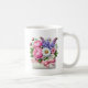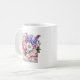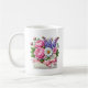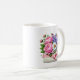 Denna klassiska vita kaffemugg visas med ett vackert tryck av en blomsterbukett för mors dag.