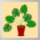 Denna fantastiska affisch har en digital konstbild av en serie blad från en krukväxt som kallas Monstera, även känd som Schweiziska ostplantan. Bladen är mörkgröna och flikiga och vissa har hål i sig. Krukan är röd och innehåller lite brun jord.