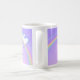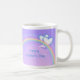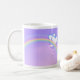 En mugg med min ursprungliga digitala konst av två vita och blå hjärtan över en regnbåge på en ljuslila eller lila himmel. Anpassningsbar text som säger "Glad Mors dag".