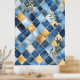 Design: Tiles in varying shades of blue form the background, decorated with golden floral and plant motifs.