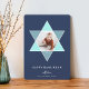 Eleganten och det moderna Hanukkah-fotokortet har en favoritfotouppsättning inuti en David-stjärna med ljusblå nyanser för en unik mosaikeffekt på rikens marinbakgrund. "Lycklig Hanukkah" förekommer under modern, ren, vit och blek grått-skrift. Anpassa med namnen längs grund och lägg till två ytterligare foton och ett personligt meddelande på baksidan.