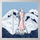 En illustration med svart och vit mossa som röda havsdelar. Himlar har en stark ljusstråle.