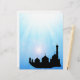 Svart silhuett av en moské på blå himmel med sol och solstrålning.